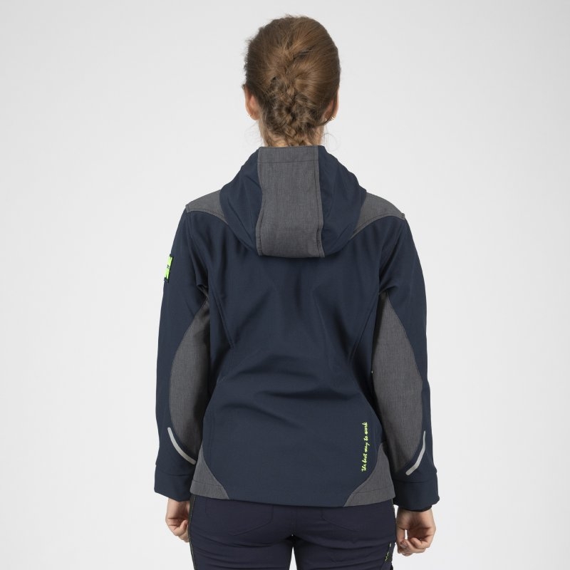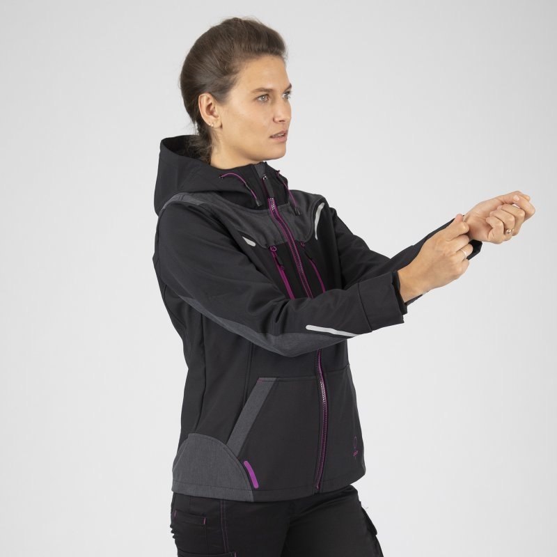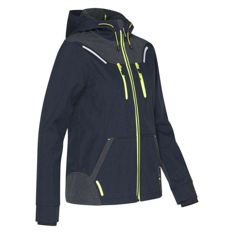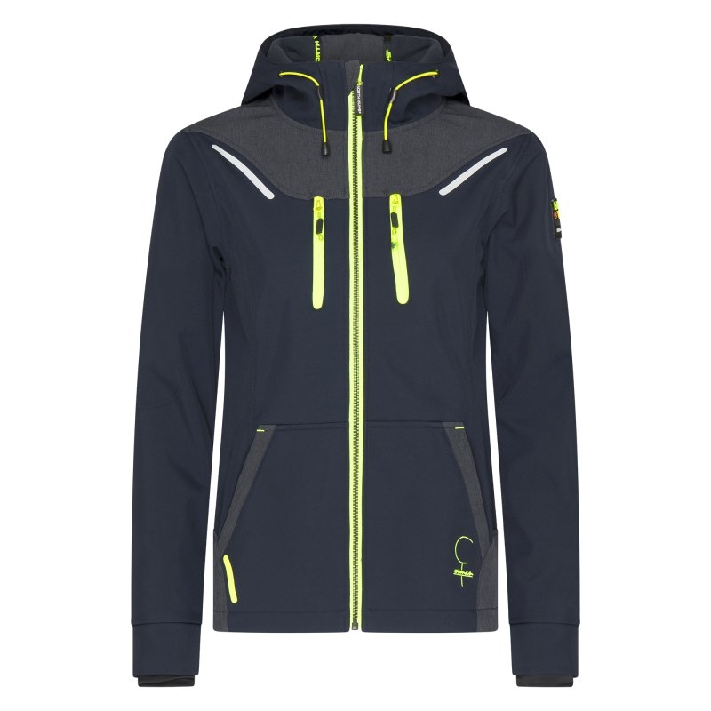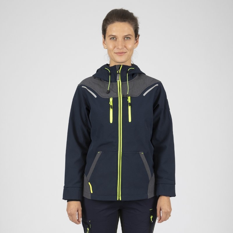 Sestava: Glavni material: 94% poliester / 6% elastan - 300 g/m² - softshell Specifikacije: Vodoodpornost 5000 mm Zračnost 2800 mvp Nastavljiva kapuca Pas pod brado 6 žepov: 4 žepi z zadrgo 2 notranja žepa Rokavi iz lycre Odsevniki