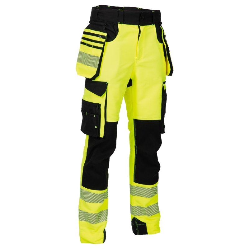 Sestava: Glavna tkanina: 65 % poliester / 35 % bombaž - 250 g/m² - žakar Stranski materiali: Raztegljiv yoke: 88 % poliamid / 12 % elastan - 230 g/m² - ripstop Ojačitev: 100 % poliamid s PU premazom - 420D - 245 g/m² - Cordura Specifikacije: Certificirano po standardu EN ISO 20471, razred 2 Povišan hrbtni del 8 žepov: 2 žepa za kolesarje 2 nalepna žepa 4 večpredmetni žepi, od katerih sta 2 odstranljiva Trojno šivanje Odsevniki